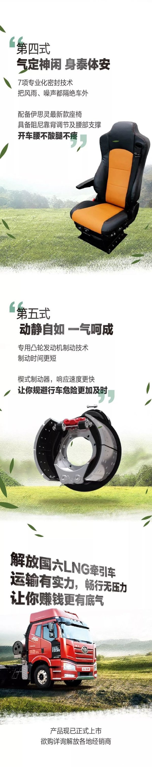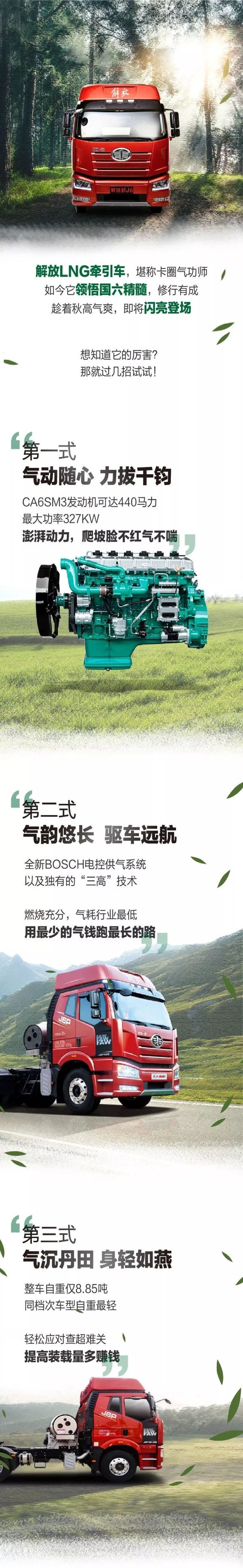 解放国六LNG牵引车,动力更强,气耗更低,自重更轻,驾乘更舒适,此外,它的发动机还独有8项可靠性技术,驾驶室拥有7项专业化密封技术,气质自适应,全国行驶不挑气等突出特点,让你开车更加省力,赚钱更有底气!