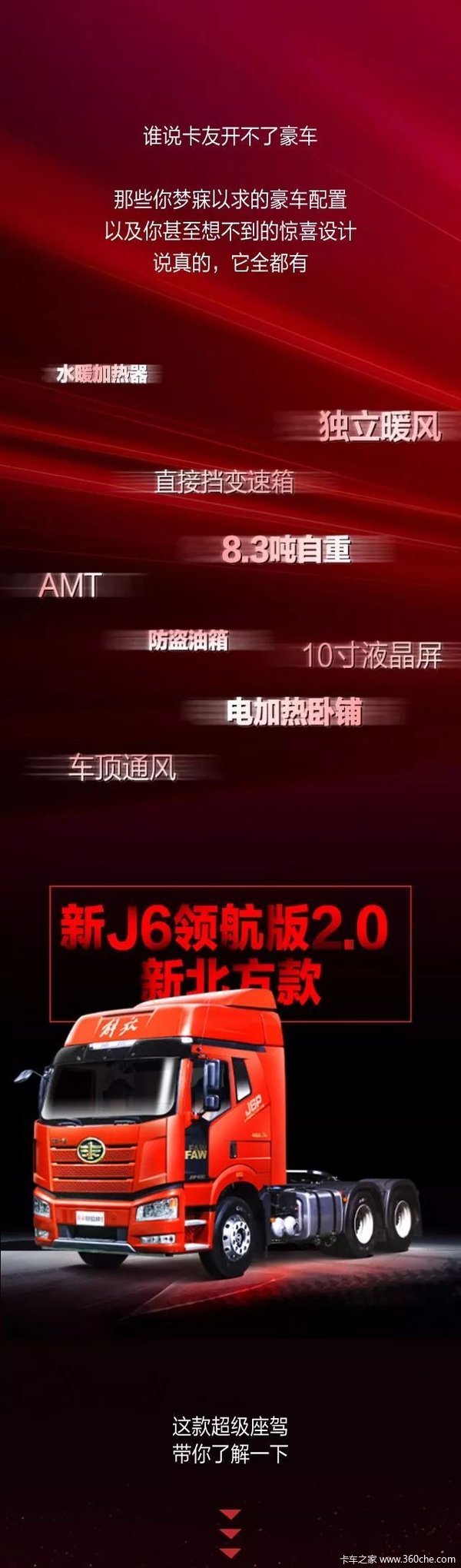 在诞生12年后,解放J6进入2.0时代。看外观,延续经典传承;看配置,紧追时代需求。解放新J6领航版2.0新北方款牵引车在新J6领航版基础上,做了非常丰富的升级和调整,而不是简单的配置堆砌。新车无论是动力、舒适性、可靠性,还是轻量化、家居化方面,都将带给卡友全新的体验。