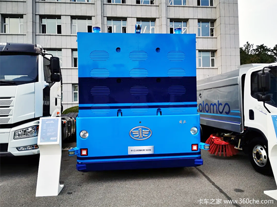 这款车采用了J6F2010宽体驾驶室,越博电机 4挡变速箱,动力电池为CATL磷酸铁锂电池。智能化方面采用了多传感器融合感知定位、精准横纵向控制智能路径决策规划、后台监控调度,V2X车路协同感知、远程OTA升级,远程驾驶等功能,可实现自动扫路作业、自动垃圾倾倒。