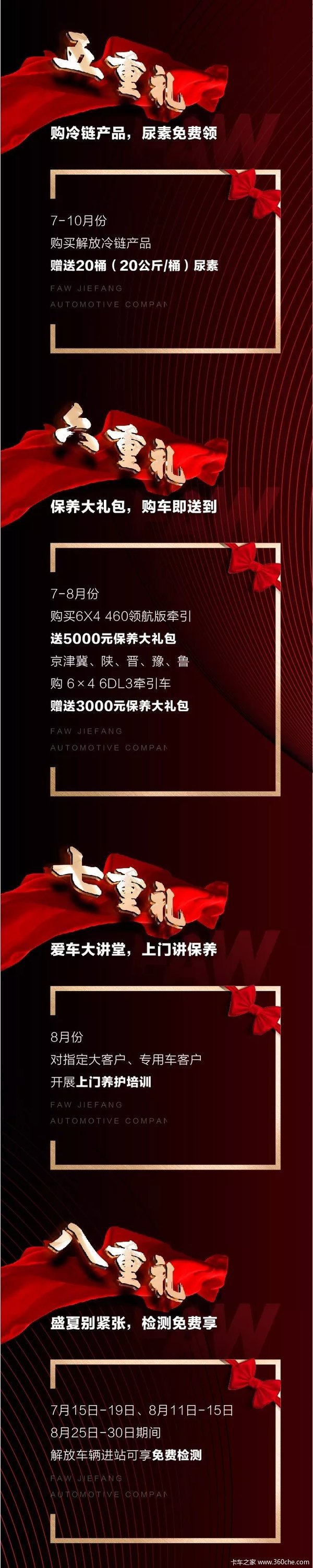 6、7-8月份,购买6X4 460领航版牵引,送5000元保养大礼包;京津冀、陕西、山西、河南、山东购6X4 6DL3牵引车,赠送3000元保养大礼包