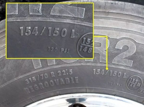 这个数字其实很有用它表示了轮胎的极限,比如上图的,表示最大载重公斤数,L代表最大时速120公里,通常卡车在E-M范围内。