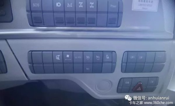 中控台上面的按钮布置让人感觉十分舒服,一共有四块按键区域,而且每个区域的功能都不同。最顶上一排,也就是显示器下面那一排是车辆的动力功能按钮,包括取力器按钮、轴间差速锁、轮间差速锁、动力模式切换。下面一排的按钮就更加偏向于实用功能,右边的是主动安全系统,最底下一排的是警示按钮。