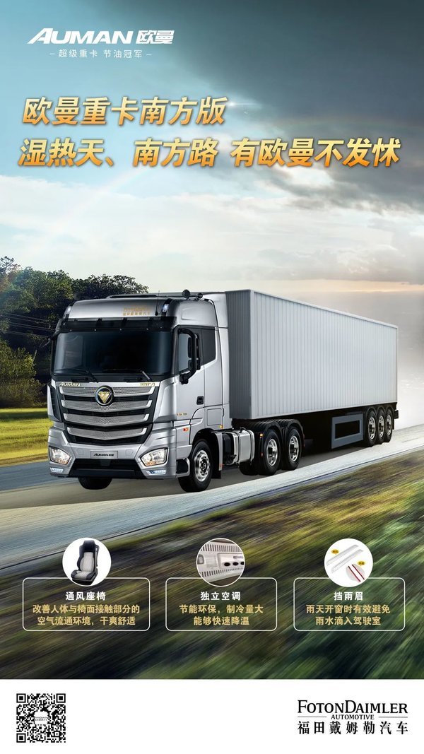 根据南方区域需求和实际使用工况,链合全球领先科技,以欧洲标准为南方区域量身定制。欧曼超级重卡以其超级高效、 超级安全、超级节油、超级舒适的超级优势,开启高效安全运输新时代。