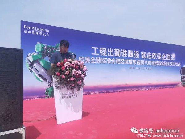 “工程出勤谁最强,最选欧曼全勤王”,5月10日,欧曼全勤标准合肥区域发布暨安徽安瑞第700台欧曼全勤王渣土车交付仪式盛大举行,来自合肥各渣土行业用户共200多人一同见证这一重要时刻。