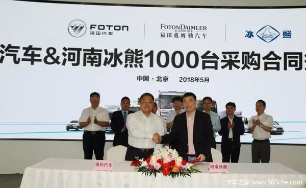 2018年5月13日,福田汽车&河南冰熊1000台采购合同签订仪式在福田戴姆勒汽车北京超级卡车体验中心举行。来自河南商丘市及民权县领导、海航冷链控股股份有限公司、河南冰熊专用车辆制造有限公司、国家电投上海融和慕众新能源科技有限公司等相关合作单位代表、福田汽车集团与福田戴姆勒汽车相关领导及行业媒体代表等50余人出席本次活动。此次,千台冷链定制超级卡车签约,标志着福田戴姆勒汽车通过为冷链物流运输提供的定制化产品和服务一体化解决方案,成功推动冷链物流运输与装备升级。