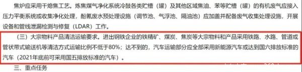 在文件中,针对钢铁行业的相关环保要求:对于进出钢铁企业的精铁矿、煤炭、焦炭等大宗物料和产品,采用铁路、水路等等方式运输。对于达不到要求,需要汽车运输的,应该全部采用新能源汽车或者是达到国六排放标准的汽车。而且,在要求的末尾还专门提到了2021年底前可采用国五排放标准的汽车。