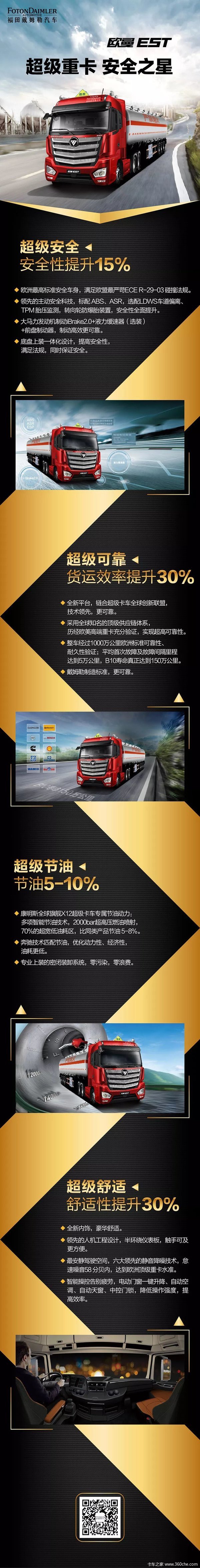 针对此,福田戴姆勒汽车通过市场研究,充分考虑危化品运输行业工况及严格执行49吨的法规要求, 链合全球领先科技,为用户量身打造符合欧洲标准的高品质危化品运输产品——欧曼EST危化品运输车,不仅实现整车质量全面提升,更能满足不同危化品中长途运输需求,为用户提供轻量化、高安全、更可靠、更节油的高效物流降本增效解决方案。