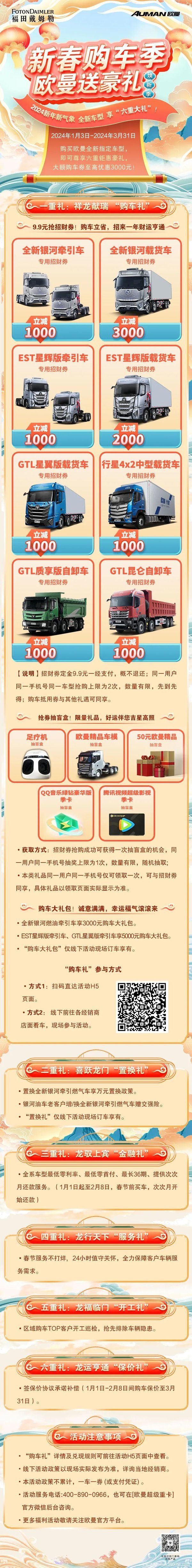 当前位置: 卡车之家 >卡车经销商 > 安徽安瑞畅达汽车销售服务 > 促销新闻 > 欧曼新春购车季丨六重大礼震撼来袭,重磅新车至高优惠3000元!