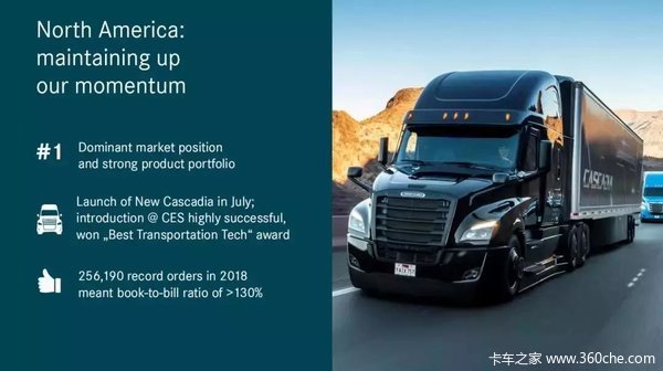 2018年,戴姆勒将自动驾驶提高到新的水平。在2018IAA车展上,戴姆勒推出了首个量产半自动驾驶功能卡车——全新梅赛德斯-奔驰Actros。新Actros为所有道路的使用者创造了更多的安全,并通过标配MirrorCam提高了效率,有效改善了驾驶员的工作场所。另一次全球首发则是在2019年1月初在拉斯维加斯举行的消费电子展上,戴姆勒卡车北美公司推出了第一辆半自动量产卡车全新福莱纳Cascadia。戴姆勒卡车的扶桑 Super Great也将于今年为其亚洲客户提供半自动驾驶服务。在引入了半自动化驾驶之后,戴姆勒公司现在正集中精力开发高度自动化的卡车。