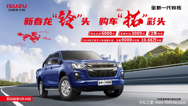 在龙年新春佳节到来之际,江西五十铃再次为全国消费者带来一份惊喜和实惠。即日起至4月30日,凡购买全新一代铃拓车型将可享受6000元现金立减优惠。迎春大促活动期间,购车者还可享受“2年购车免息"的超值金融豪礼以及"3000元置换补贴",综合优惠让利幅度至高可达9000元。仅需10.68万元起,就能让你轻轻松松把铃拓开回家。