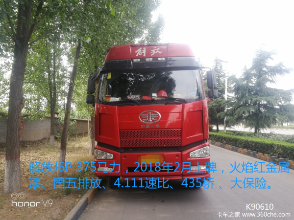 解放J6P 375马力,2018年2月上牌,火焰红金属漆、国五排放、4.111速比、435桥 、大保险