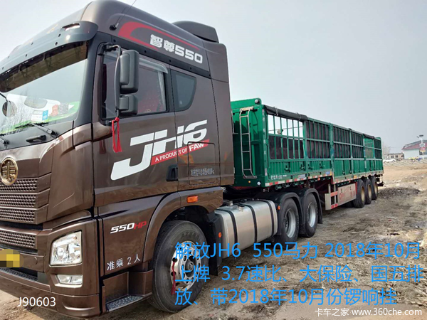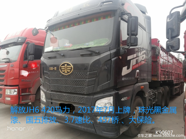 解放JH6 420马力,2017年7月上牌,珠光黑金属漆、国五排放、3.7速比、457桥 、大保险。带挂车