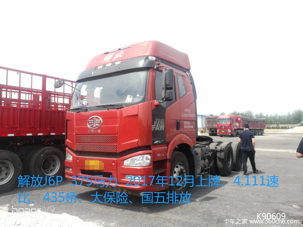 解放J6P 375马力,2017年12月上牌,火焰红金属漆、国五排放、4.111速比、435桥 、大保险。