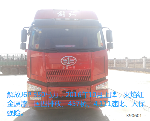 解放J6P 350马力,2016年10月上牌,火焰红金属漆、国四排放、457桥、4.111速比、人保强险。
