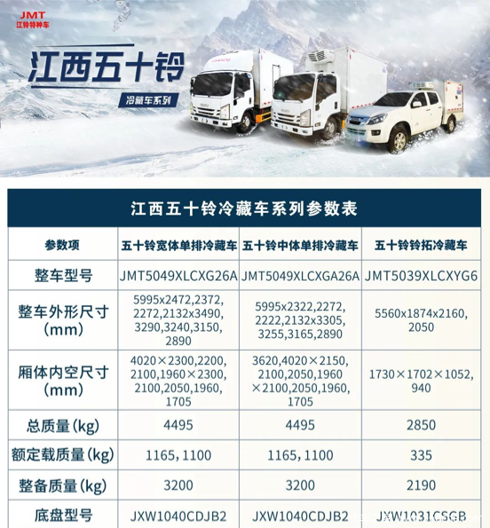 江西五十铃冷藏车系列是冷链市场的主要车型,一直受到众多冷藏车友的关注,因为轻卡冷藏车不管是市区内的出入,还是城镇间的运输,用来运输冷冻兼保鲜的封闭式厢式运输车。是装有制冷机组和隔热厢的冷藏专用运输汽车,常用于运输冷冻食品(冷冻车),奶制品(奶品运输车)、蔬菜水果(鲜货运输车)、疫苗药品(疫苗运输车)等。江西五十铃轻卡可改装的冷藏车有:江铃特种车、湖北长兴机械、广东顺肇专汽、江西金沙,这几种车型国VI排放,整车质量轻,上牌不烦恼;低油耗,高端动力;厢体用材好,隔热更保温;制冷效率高,品牌有保障。