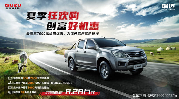 即日起至9月30日,购柴油经典瑞迈即享666抵2666元现金优惠;江西客户再享2000元地产车补贴;皮卡客户再享3000安增换购补贴;购车享2年免息金融礼。四惠降临,全系车型最低8.28万,升级优惠,助力更多人的创富梦想。