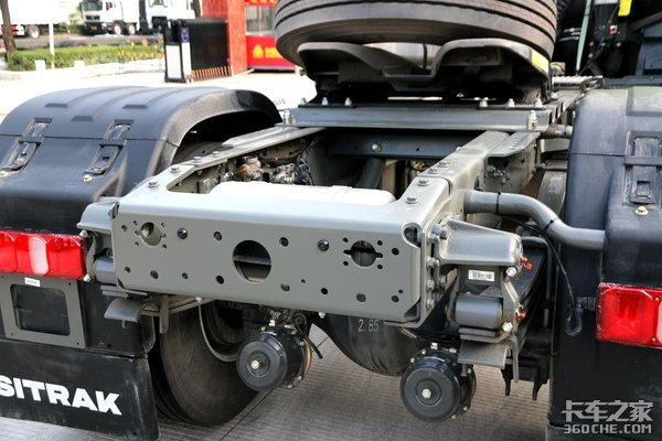 这是应用德国曼技术的TGA-B轻量化车架,采用轻量化铸造横梁、轻量化的V型推力杆 后稳定杆,整个底盘得到了有效降重,整备质量在6.8吨左右。