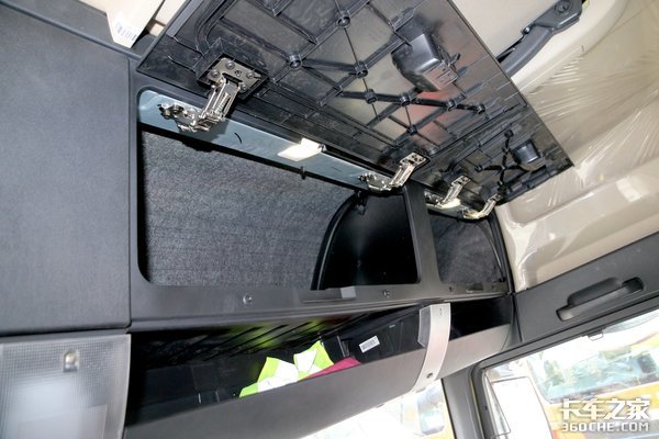 驾驶室上方跟大部分的重卡一样,有效利用空间设置了三个超大号的储物柜,柜门打开的时候还带有阻尼感,细节之处尽显高级感。这三个储物柜平时能够置放大件的生活物品,例如衣物、被子或者柴米油盐也是可以的。