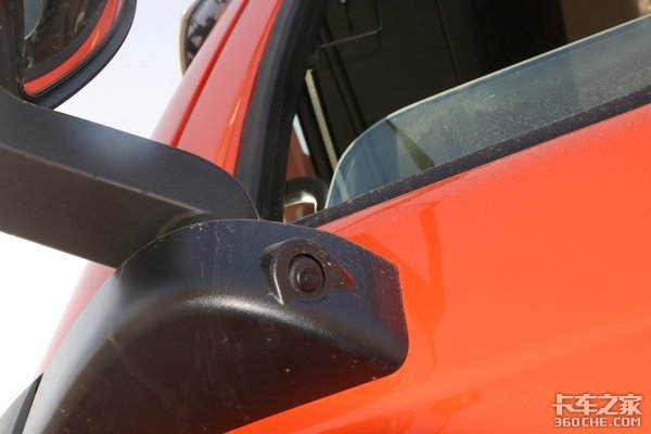 在两侧的后视镜底座上集成了斜向下角度的监控摄像头,这也是该车配备的四路监视器的组成部件。该功能非常便于车辆在靠台作业、倒车以及复杂路况中行驶时对车辆周围以及挂车进行观察,提高行驶安全。