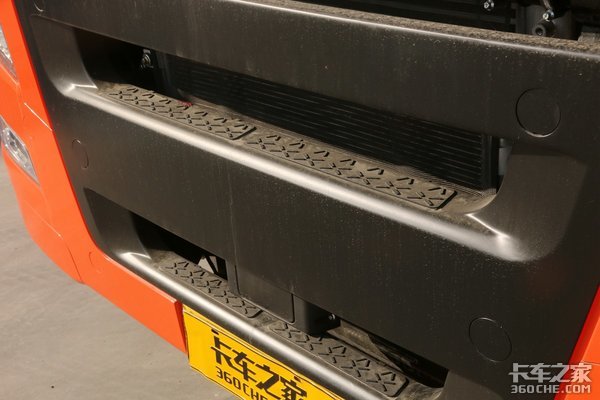 保险杠中间设置了带有防滑纹路处理的两级蹬车梯,方便卡友们在洗车或者检查的时候使用。下方那个矩形小黑块则是组成防碰撞预警系统的毫米波雷达模块。