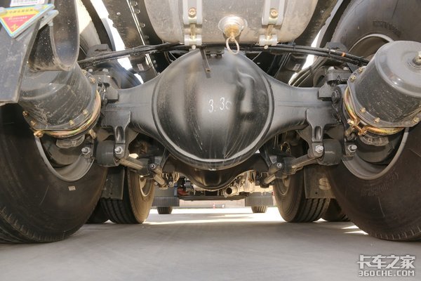 该车采用的是MCY12BGS后桥,后桥速比为3.36。这款MCY12后桥是重汽是去年新推出的车桥,这款车桥既具备MCY11车桥的轻量化,同时又可以媲美MCY13车桥的承载能力,目前在重汽的车桥上应用非常广泛。并且使用了V型推力杆,能够有效减少车辆行驶过程中的车架的位移问题,保障车辆在复杂路况中行驶时的稳定性。