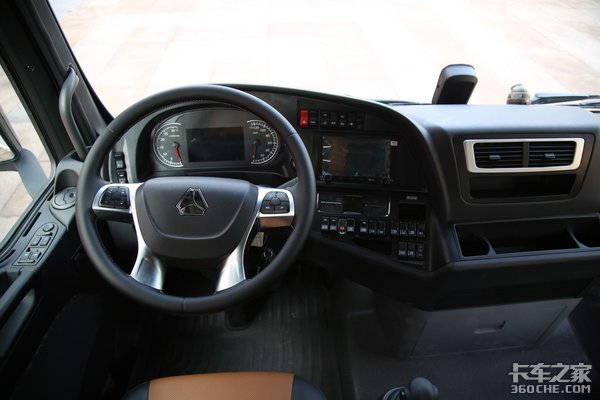 我们再看内饰,在车门内把手处布置着中控锁、一键升降、电动后视镜及电加热等功能。方向盘是四幅式多功能的设计,而中控台上整体的设计是偏向于主驾一侧的,这也是为了更方便驾驶员操作。此外,中控台配的显示屏不是很大,但功能齐全,支持中国重汽智能通系统,还有影音娱乐、随车Wifi、蓝牙导航等功能。