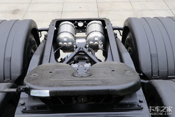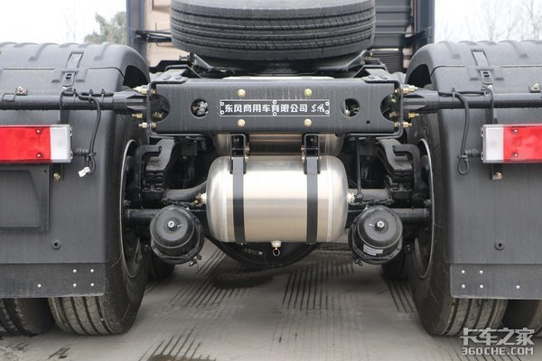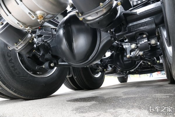 底盘方面,后桥采用的是双440单级桥,速比2.69,悬架的板簧采用2/3(前2后3)的形式。油箱是采用双油箱设计,总容积为600L 250L,为铝合金材质箱体。轮胎的型号为295/80R22.5,采用的是风神牌真空胎。