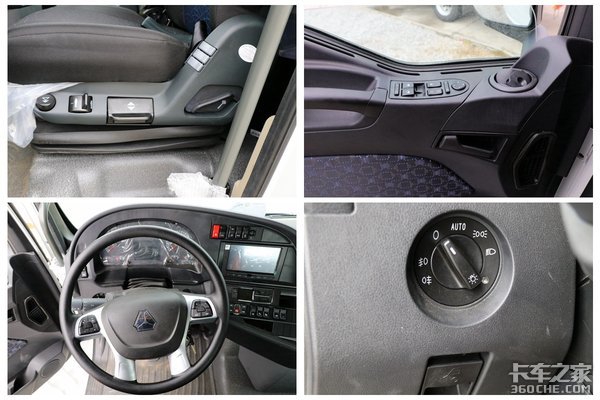 中控台区域配有多媒体液晶显示屏,支持中国重汽智能通系统,还有影音娱乐、随车Wifi、蓝牙、导航、故障诊断等功能;其下方带有自动恒温空调、节油开关、差速锁等功能按键,全方位的让驾驶员操作时省心更省力。侧边是空调出风口,还设计有两个水杯放置孔,最下面就是推拉式储物格,存放东西很方便!