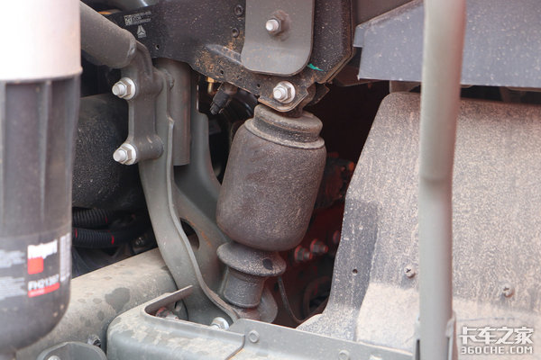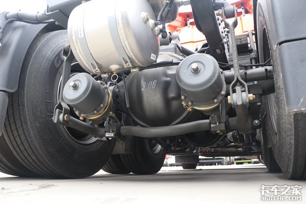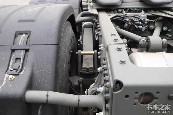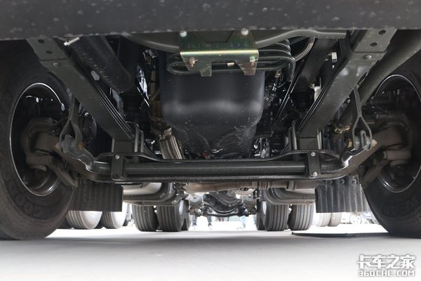 实拍车前后桥均为钢板弹簧,采用前2后3的数量设定,在实现轻量化的同时也保障了整车的承载潜力。同时,该车后桥提供气囊悬架的选装,价格基本上贵一万左右,如果你运输的货物附加值比较高,路况条件相对较好,那么这样的配置绝对是首选。