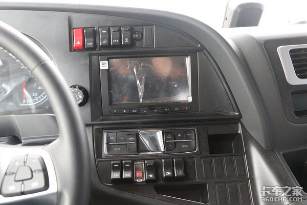 中控台的设计还是一如既往的重汽风格,上方为灯光高度调节和轮间及轴间的差速锁控制,中间为尺寸适中的中控屏幕,可以显示导航、音乐、360环影等功能,最下方为自动空调、碰撞预警、车道偏离等开关。行车配置方面,C7H还是基本面面俱到。
