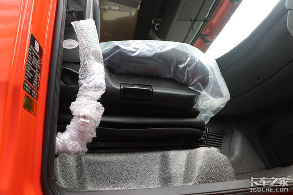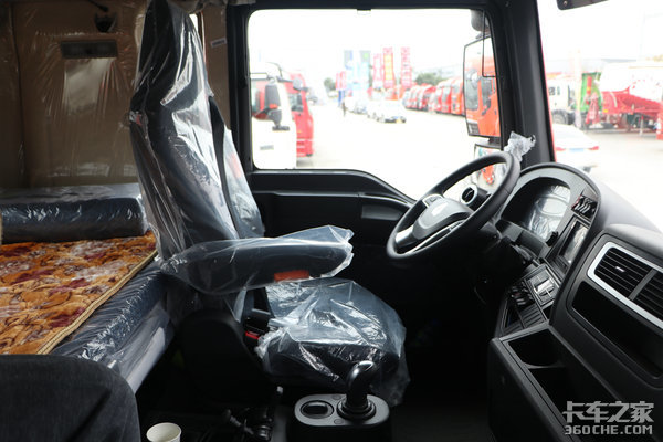 座椅采用了气囊式座椅,主副驾的座椅俯仰和高度均可调节,同时主驾还支持腰部背部等多方位调节。内饰整体以黑色塑料材质为主,驾驶舱内部采取了纯平地台的设计,方便了中间过道的使用便捷性,卡友们也不用“翻山越岭”去到副驾拿东西了。