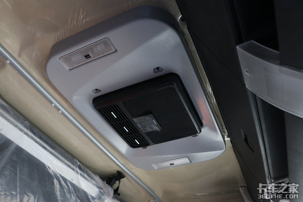 车顶部分可以看到该车设计了一个驻车空调,这样不论是冬天还是夏天,卡友们在驻车休息时都能提供一个更舒适的车厢温度,在一般情况下,驻车空调都设计有低电压保护装置,不会导致电瓶缺电,从而影响车辆的启动。