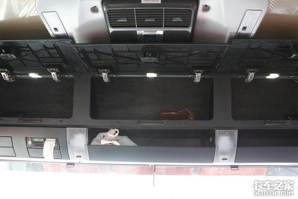 车辆顶部配有三个尺寸巨大的储物箱,方便堆砌一些不常用的杂物,下方还有两个带挡板设计储物格,尺寸同样比较可观,车顶没有天窗,取而代之的是驻车空调,非常实用的一项配置,即便是在停车的状态下也能带来更加舒适的休息环境。