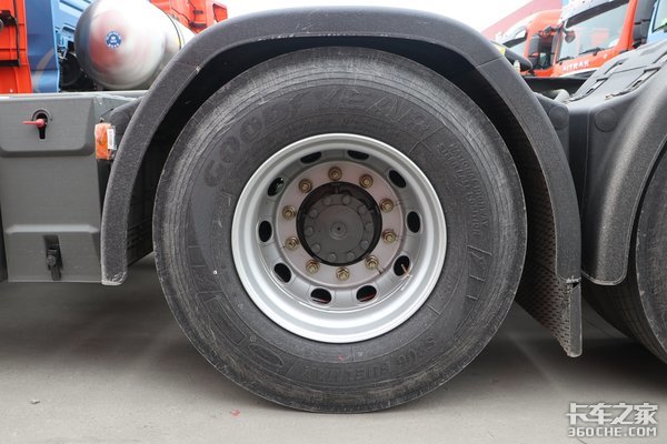 全车轮胎皆为固特异品牌,全车轮胎尺寸为12R22.5,突显了重汽C7H的高端定位。整车的前轮为铝合金车轮,后轮为传统钢制车轮。