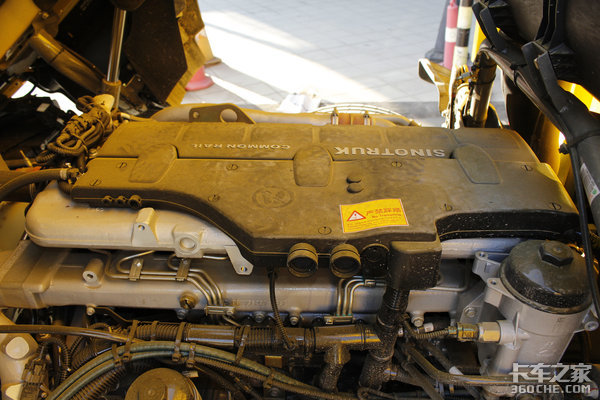 实拍车型搭载一台型号为MC07.28-50的中国重汽直列六缸发动机,6.87L排量,最大功率280马力,最大扭矩1100N.m,最大扭矩输出转速为1200-1800rpm,满足国五排放标准。