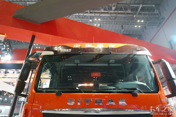 车顶配备了大尺寸的遮阳罩,一定程度上阻挡了紫外线的直接照射,提高驾驶舒适性。并且在造型上设计了一个凹面,将“中国重汽”品牌字体露出得非常巧妙和谐。