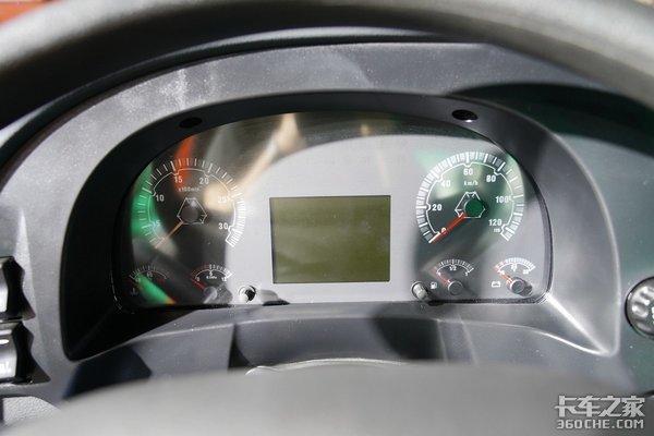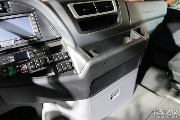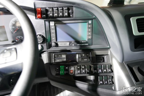 方向盘的右边是整个车辆控制面板,其中包含了车辆灯光控制、差速锁开关、插卡式行驶记录仪、自动空调控制面板、紧急呼叫、后桥提升控制、电源开关、碰撞预警开关、定速巡航、车道偏离预警开关等等一系列配置。