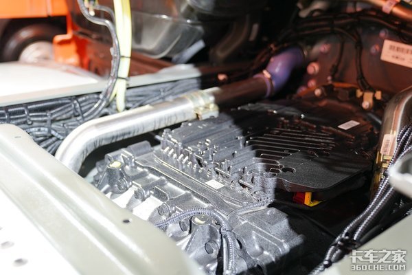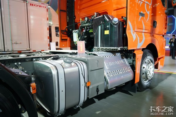 车架右侧则主要集成了达到国六排放标准的后处理系统、电源以及300L的油箱,整体铝合金材质的覆盖和使用,让整个车架两侧的集成度和整体性非常高。而同样采用轻量化材质的90L的尿素罐被安排到了驾驶室后方,整体的空间利用达到极致。
