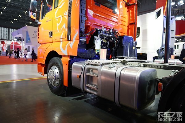 车架左侧设置了一个容积为600L的油箱,铝合金材质的箱体进一步降低整车自重。并且内嵌了两级蹬车梯,方便直接上到车架上去操作和检查等。