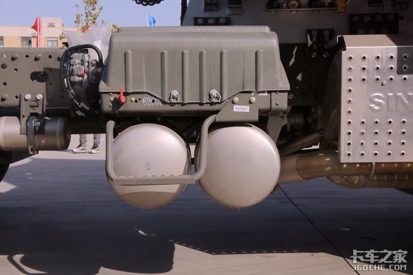 电瓶以及铝合金储气筒采用常见的上下结构布置方式。电瓶防护罩的防护效果还是比较好的,铝合金的储气筒则布置在电瓶下方。电瓶的左边是威伯科的空气干燥器,整体布局相对比较紧凑。