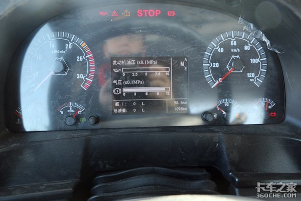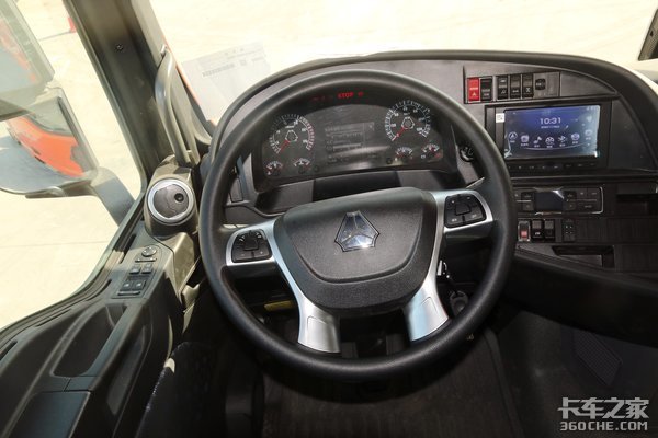 组合式的仪表盘,充满重汽的色彩。左右两边的大表盘分别是发动机的转速表和车辆的时速表,中间的显示屏则显示发动机油压、气压等信息,让驾驶员可以对车辆的运行状态有一个良好的掌握。