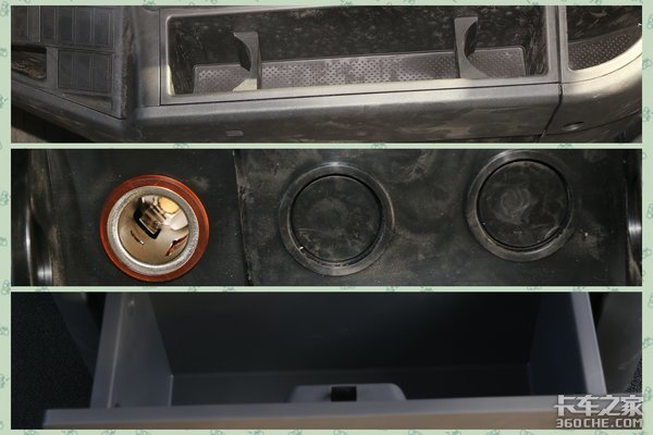 在其下方,配置就比较有意思了。双杯座以及矩形的储物盒,就先不多说了。这个黑色的面板,按压后会呈扇形打开,里面有电子点烟器以及2个烟灰缸,下方灰色的扣环,拉开后是一个密封性非常好的储物盒,无论是放随车材料,还是零食,都是比较合适的。