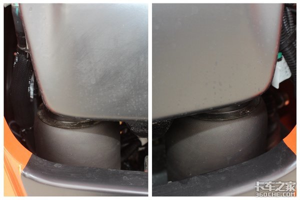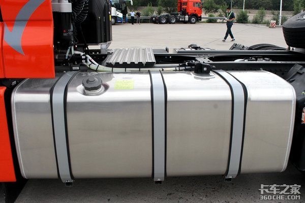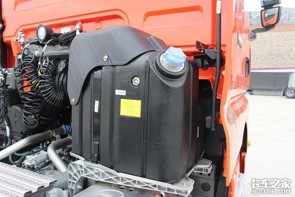 汕德卡G7最突出的亮点就是它把尿素罐放到了导流罩的后面,给车架的两侧腾出更大的空间。这样一来,车架两侧就可以装一个860升的大油箱和一个240升的小油箱,一共1100升的油箱组合保证了续航里程。