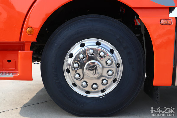 该车配备普利司通轮胎,规格为12R22.5,并带有铝合金车轮。根据轮胎规格、变速箱最高挡速比1、后桥速比3.08,通过卡车之家车速计算器可算出,在最高挡、车辆1200-1300转时,时速可达到77-83km/h,很明显是针对当下高效物流而来。