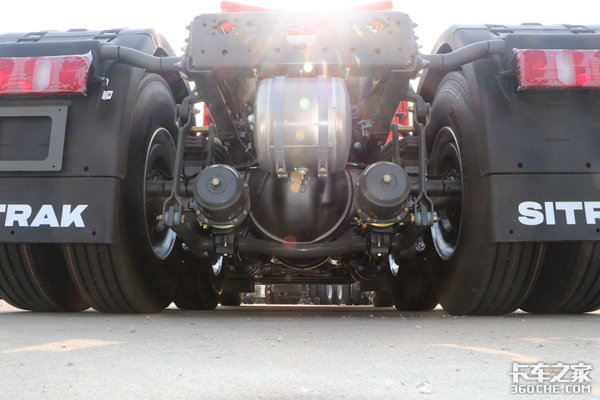 底盘方面,这款车采用前2后3少片簧悬架结构,这也是当下高端轻量化牵引车的主流配置,兼顾自重和承载性。配备重汽12吨后桥,型号为MCY12BGS,速比3.08。