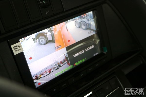 这辆汕德卡奢华版配备有四方位摄像头,从而形成全方位环绕影像,该套系统在车辆正面和两侧后视镜上分别加入了摄像头,此外在后方也预留了改装线路。当匹配好挂车之后,可以在尾部加装摄像头。