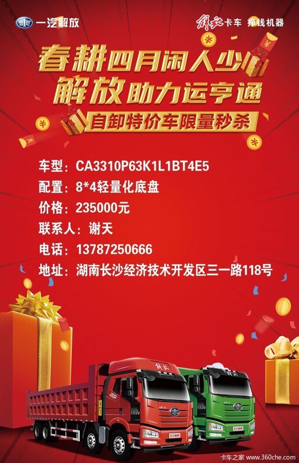 当前位置: 卡车之家 >卡车经销商 > 长沙一汽汽车 > 促销新闻 > 四月春耕J6P自卸限量车秒杀活动,想要的老板赶紧咨询哦!