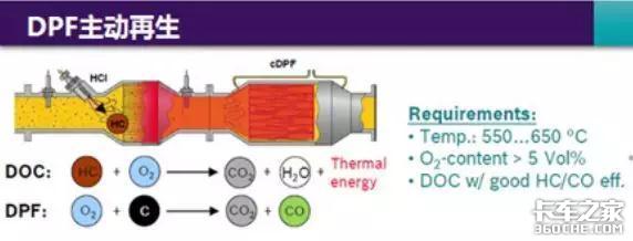 当DPF的温度高于250度时,DPF再生就在不知不觉中进行。如果恰巧温度无法达到250时,我们就需要通过主动再生的方式,加大发动机功率输出,或通过后置喷油器直接向DPF中喷油,通过燃烧的方式将捕捉的颗粒物燃烧殆尽,达到清理DPF的作用。这个工作温度,甚至达到5、6百度。