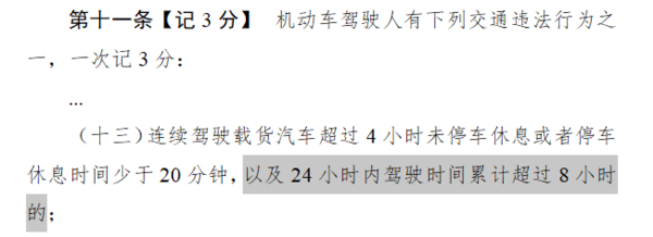 根据公安部新起草的《道路交通安全违法行为记分管理办法(征求意见稿)》,增加了载货车24小时内行驶时间累计超过8小时扣3分的规定。