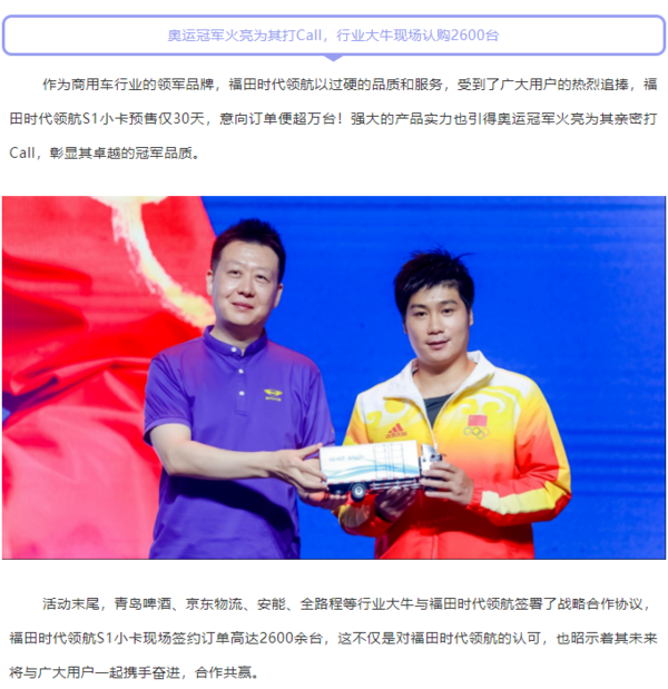 当前位置: 卡车之家 >卡车经销商 > 潍坊鸿业汽车销售服务(驭菱) > 促销新闻 > 国民好小卡丨奥运冠军为它打Call!福田时代领航魔都上海S力觉醒